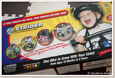 先ほどヴィレッジヴァンガードで購入してきたストライダーを早速組み立てることにしました。よく見ると箱に貼られていたポップをもってきてしまいました……
